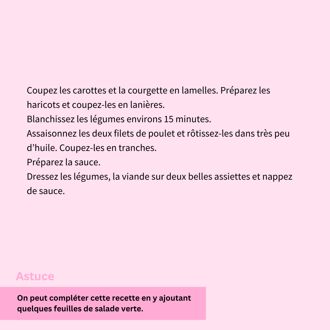 Assaisonnez les deux filets de poulet et rôtissez-les dans très peu d’huile. Coupez-les en tranches.