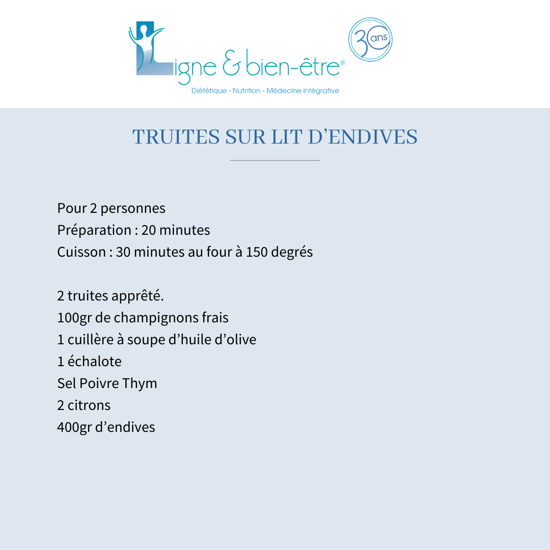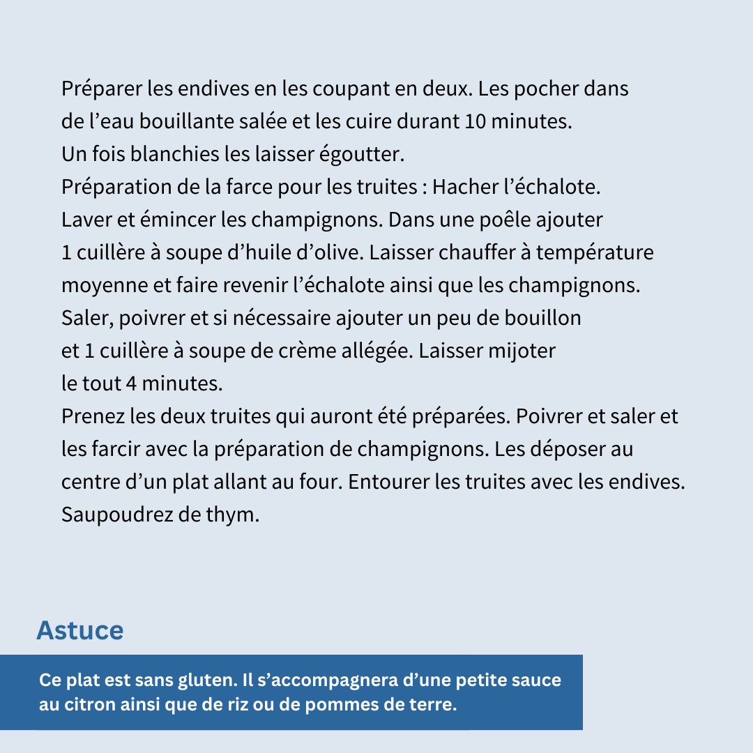 Prenez les deux truites qui auront été préparées. Poivrer et saler et les farcir avec la préparation de champignons. Les déposer au centre d'un plat allant au four. Entourer les truites avec les endives.